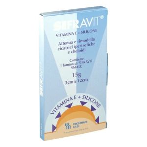 SIFRAVIT è un prodotto ottenuto miscelando un gel di silicone ad alta purezza con Vitamina E in concentrazione appropriata. Questa miscela esplica un effetto sinergico nel rimodellamento di cicatrici ipertrofiche e cheloidi di qualsiasi natura. Infatti, sono individualmente note le proprietà delle lamine di Silicone e della vitamina E nell’attenuare il rilievo ed i sintomi della patologia cicatriziale. Le prime per mezzo di una azione prevalentemente occlusiva, in grado cioè di modificare la concentrazione idrica del compartimento interstiziale, la seconda (Vitamina E) da lungo tempo utilizzata in somministrazione per via generale, per il suo effetto antiossidante e disaggregante di fasci di fibre collagene. La miscelazione dei due componenti consente alla Vitamina E di rendersi biodisponibile negli strati cutanei dove è richiesta la sua azione con un meccanismo di lento e costante rilascio, reso possibile dall’azione occlusiva e permeante del gel di silicone. Si ottiene quindi un potenziamento dell’effetto di rimodellamento, che può essere osservato sia su cicatrici fresche sia di vecchia data applicano il prodotto a diretto contatto con la cicatrice per un adeguato periodo di tempo