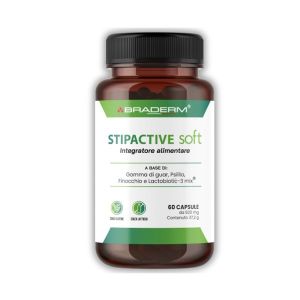 STIPACTIVE SOFT 60CPS è un integratore alimentare di BRADERM Srl. Contiene gomma di guar, psillio, finocchio e Lactobiotic-3MIX, una miscela di fermenti paraprobiotici non vitali, per favorire la regolarità del transito intestinale e migliorare il volume e la consistenza delle feci.